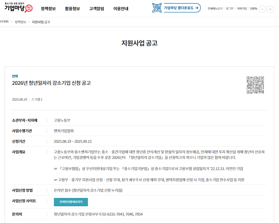 기업마당 홈페이지 지원사업 공고란에 이미 2026년 청년일자리 강소기업 신청 공고가 올라와있습니다.