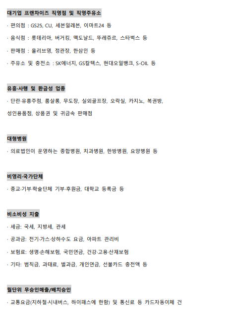 - 교통요금 : 지하철, 시내버스, 하이패스), 통신료 등 카드자동이체 건