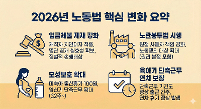 2026년의 노동법 변화는 '근로자 권익 보호의 강화'와 '사업주 책임의 엄격화'로 요약할 수 있습니다.